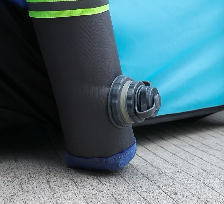Monteringsanvisning: Börja med att lägga ut tältet på marken och blåsa upp de tre luftbågarna med den medföljande hamdpumpen (alternativt egen elektrisk pump om så önskas). Trä sedan den ljusblåda delen med den ensamma luftbågen över bagageluckan och knäp fast spännena nedtill under bilen. Sträck ut tältet bakåt och fäst regnskyddet ovanpå tältet med dess fyra fästpunkter / clips. ANvänd sedan linorna och tältspiken för att förankra hörnen på de korslagda luftbågarna i marken. Vid behov (om det ej går att fästa tältspiken i marken) kan du fylla sandpåsarna och använda dessa som mothåll.